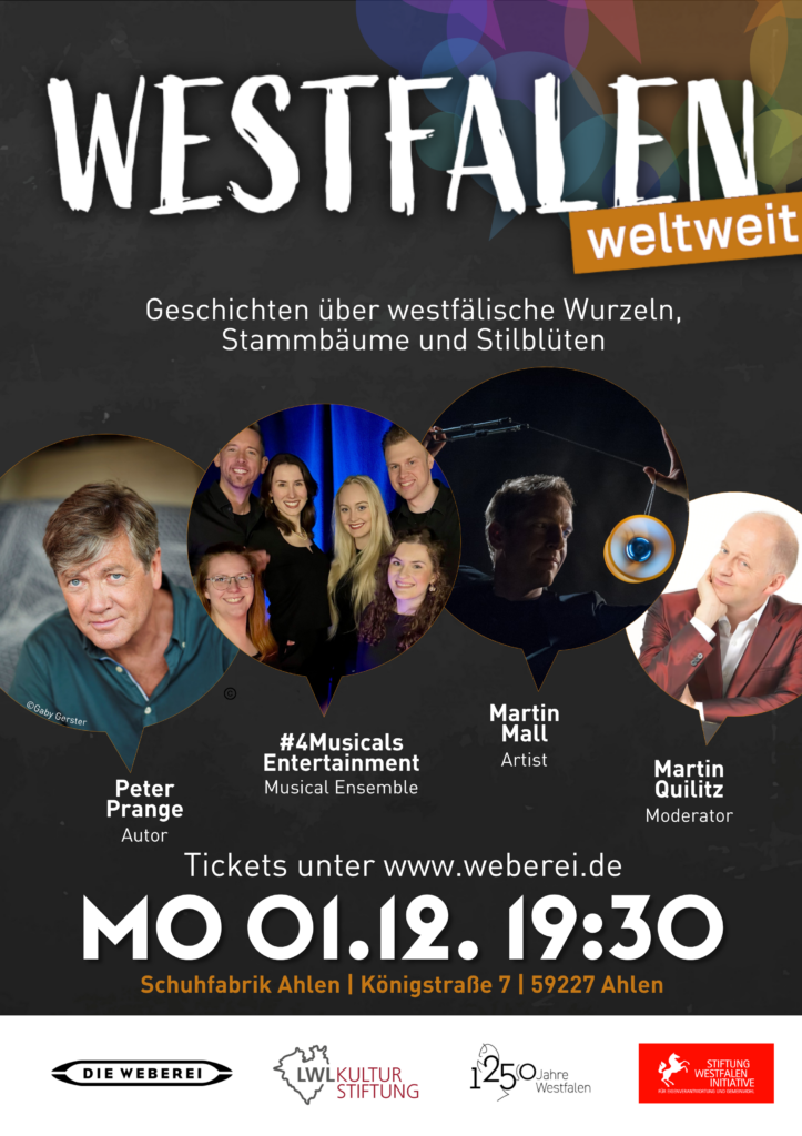 Diese Veranstaltungsreihe rückt Menschen ins Zentrum, die Brücken zwischen Westfalen und der Welt schlagen. Vorgestellt werden Westfälinnen und Westfalen, deren Wirken weit über die Region hinausreicht, ebenso wie Menschen aus aller Welt, die Westfalen prägen und bereichern. Die Bühnenshows beleuchten die spannende Begegnung zwischen westfälischen Wurzeln und internationalen Erfahrungen in Kultur, Sport, Politik und Gesellschaft.