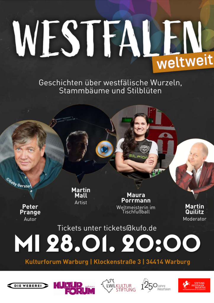 Diese Veranstaltungsreihe rückt Menschen ins Zentrum, die Brücken zwischen Westfalen und der Welt schlagen. Vorgestellt werden Westfälinnen und Westfalen, deren Wirken weit über die Region hinausreicht, ebenso wie Menschen aus aller Welt, die Westfalen prägen und bereichern. Die Bühnenshows beleuchten die spannende Begegnung zwischen westfälischen Wurzeln und internationalen Erfahrungen in Kultur, Sport, Politik und Gesellschaft.