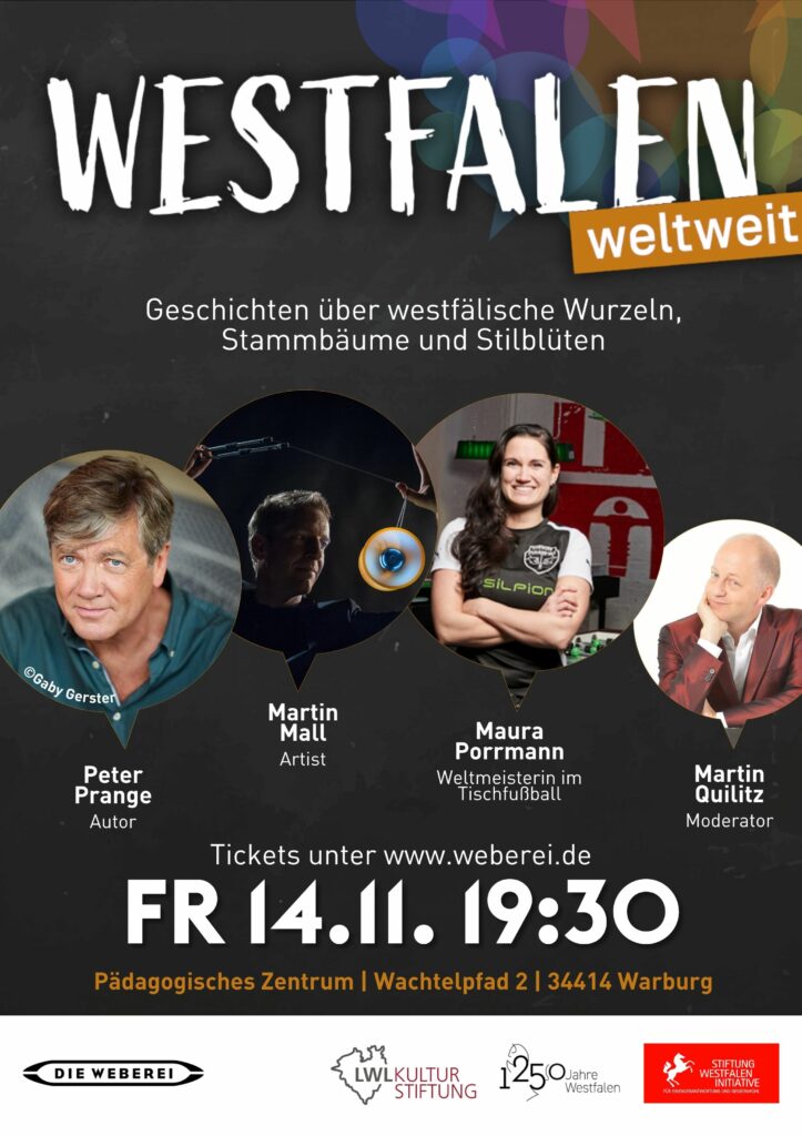 Diese Veranstaltungsreihe rückt Menschen ins Zentrum, die Brücken zwischen Westfalen und der Welt schlagen. Vorgestellt werden Westfälinnen und Westfalen, deren Wirken weit über die Region hinausreicht, ebenso wie Menschen aus aller Welt, die Westfalen prägen und bereichern. Die Bühnenshows beleuchten die spannende Begegnung zwischen westfälischen Wurzeln und internationalen Erfahrungen in Kultur, Sport, Politik und Gesellschaft.