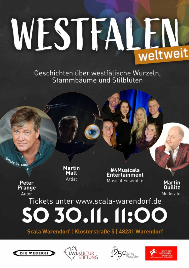 Diese Veranstaltungsreihe rückt Menschen ins Zentrum, die Brücken zwischen Westfalen und der Welt schlagen. Vorgestellt werden Westfälinnen und Westfalen, deren Wirken weit über die Region hinausreicht, ebenso wie Menschen aus aller Welt, die Westfalen prägen und bereichern. Die Bühnenshows beleuchten die spannende Begegnung zwischen westfälischen Wurzeln und internationalen Erfahrungen in Kultur, Sport, Politik und Gesellschaft.